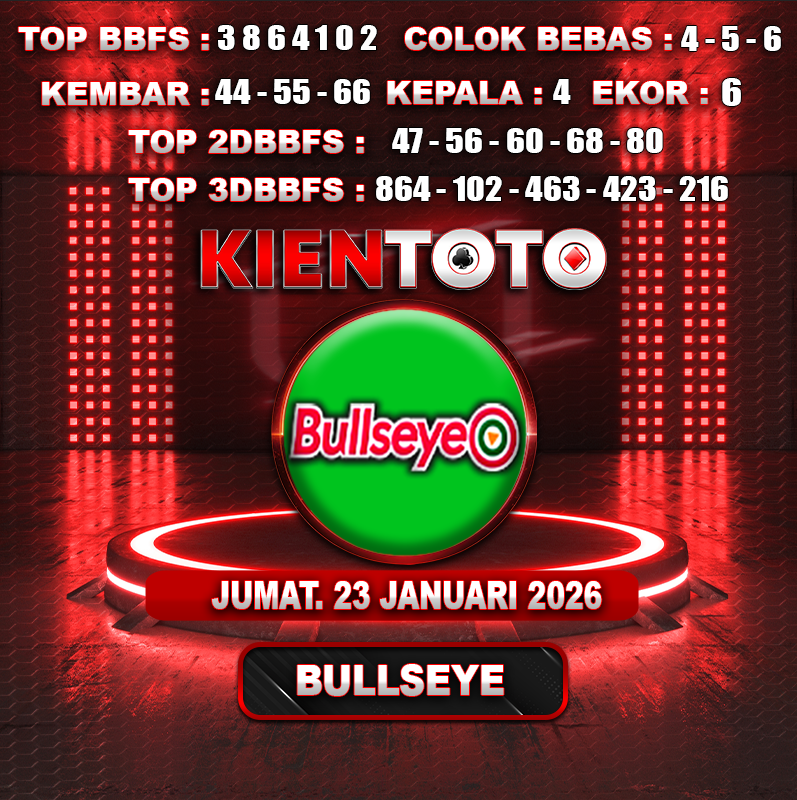 PREDIKSI TOGEL BULLSEYE 23 JANUARI 2026 Selamat Datang dan Selamat Bergabung di Situs Prediksi Togel Online. Permainan Togel Online saat ini telah menarik banyak perhatian para bettor di Indonesia. Jika dulunya Anda harus menikmati permainan togel melalui bandar togel darat, maka sekarang ini Anda hanya perlu mempercayakan KIENTOTO sebagai Bandar Togel Online Resmi dan Terpercaya. Melihat semakin tingginya minat para pecinta togel online, kami menyediakan Situs Prediksi Togel Online dan Bocoran Togel Jitu yang bisa Anda jadikan sebagai acuan sebelum melakukan pemasangan angka togel.
