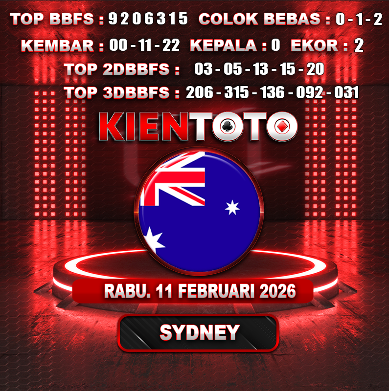 PREDIKSI TOGEL SYDNEY 11 FEBRUARI 2026 Selamat Datang dan Selamat Bergabung di Situs Prediksi Togel Online. Permainan Togel Online saat ini telah menarik banyak perhatian para bettor di Indonesia. Jika dulunya Anda harus menikmati permainan togel melalui bandar togel darat, maka sekarang ini Anda hanya perlu mempercayakan KIENTOTO sebagai Bandar Togel Online Resmi dan Terpercaya. Melihat semakin tingginya minat para pecinta togel online, kami menyediakan Situs Prediksi Togel Online dan Bocoran Togel Jitu yang bisa Anda jadikan sebagai acuan sebelum melakukan pemasangan angka togel.