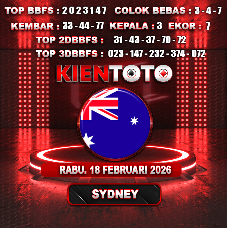 PREDIKSI TOGEL SYDNEY 18 FEBRUARI 2026 Selamat Datang dan Selamat Bergabung di Situs Prediksi Togel Online. Permainan Togel Online saat ini telah menarik banyak perhatian para bettor di Indonesia. Jika dulunya Anda harus menikmati permainan togel melalui bandar togel darat, maka sekarang ini Anda hanya perlu mempercayakan KIENTOTO sebagai Bandar Togel Online Resmi dan Terpercaya. Melihat semakin tingginya minat para pecinta togel online, kami menyediakan Situs Prediksi Togel Online dan Bocoran Togel Jitu yang bisa Anda jadikan sebagai acuan sebelum melakukan pemasangan angka togel.